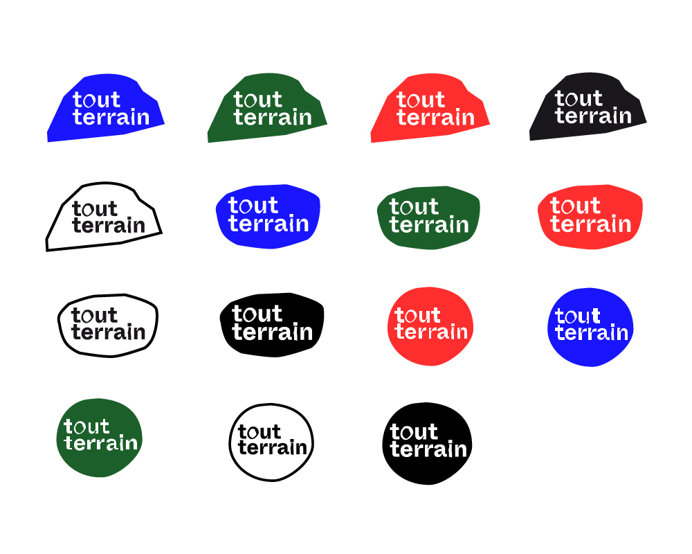 La White inktrap trial dégage quelque chose de sûr, "une bonne base", où va venir s’intercaler des "interventions" plus libres au sein de cet espace normé qu’est la typographie. Plusieurs lettrages ont donc été spécialement créés que l’on peut classer en trois familles : la construction, le découpage et l’écriture à la main. L’ensemble typographie + lettrage nouvellement conçu, donne à tout terrain son caractère pleinement éclectique et engagé. De ces lettrages émergent plusieurs formes exprimant des formes découpées, déclinées en se superposant dans des compositions abstraites ouvertes à l’interprétation de chacun. Ici une montagne ? Un paysage ? Ici un "E" qui, renversé, forme une vieille batisse ? Ces éléments s’inscrivent dans une gamme de couleur qui fait à la fois appel à un terrain de jeux et à la nature : bleu, jaune, vert et une pointe de rouge pour dynamiser l’ensemble.