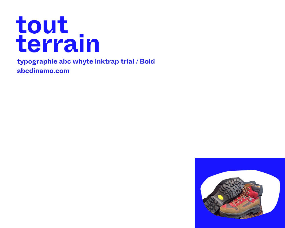 La typographie d’ABC Dynamo White inktrap trial Bold, a été choisie pour ses "pièges à encre" très prononcés, qui, dans le contexte du mot "terrain" fait un petit rappel au crampons d’une chaussure de randoneur ou de chantier que l’on doit revétir pour arpenter des territoires.