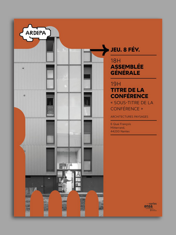 – Un deuxième jeu d’affiche sur fond de couleurs déclinables avec la photo en noir et blanc au format 4/3. La composition permet de communiquer sur un événement.