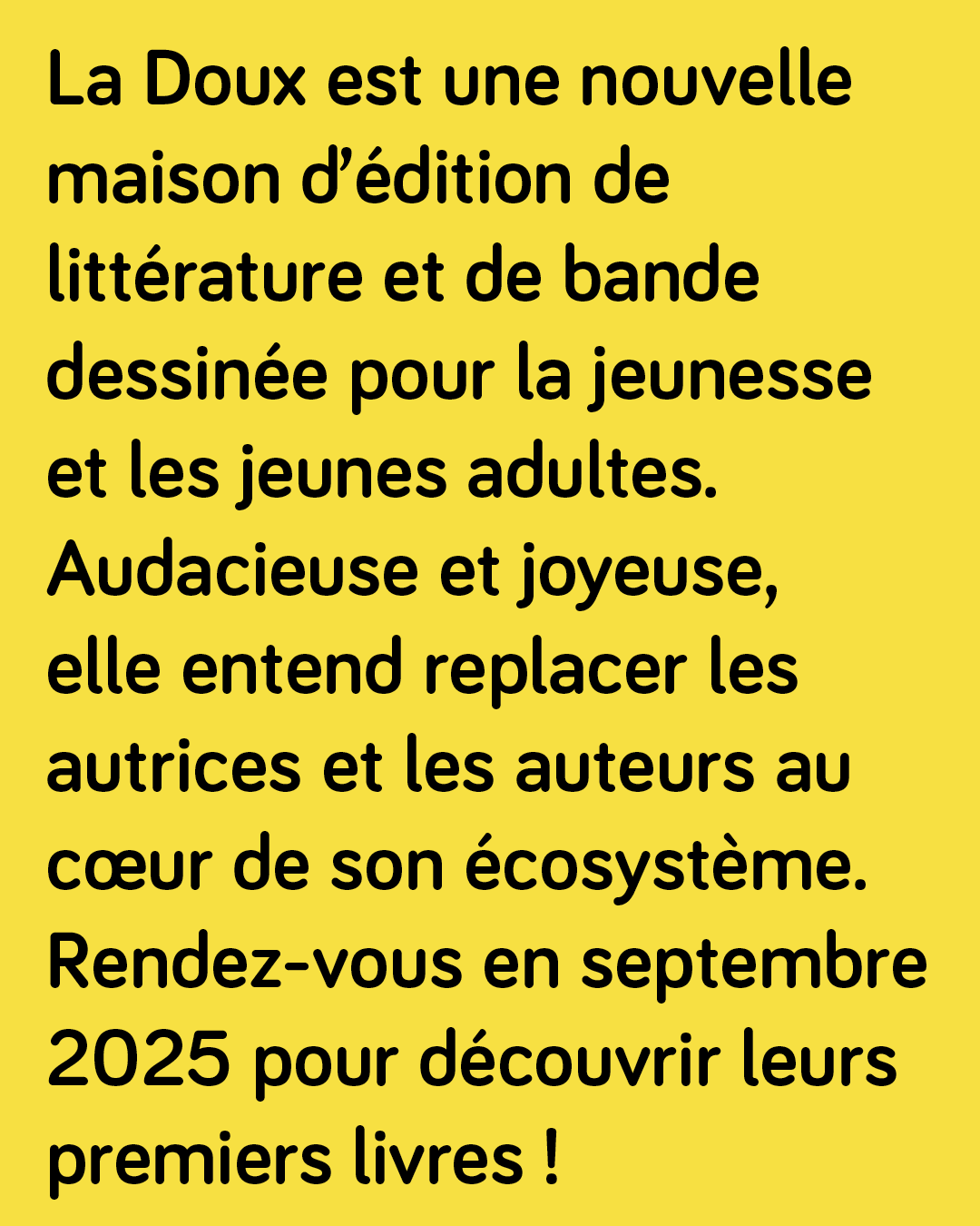 La Doux est une nouvelle maison d’édition de littérature et de bande dessinée pour la jeunesse et les jeunes adultes.elle tient son nom d’une petite rivière qui longe le Moulin de la Doux, en Corrèze, lieu de résidence pour y accueillir les auteurs.